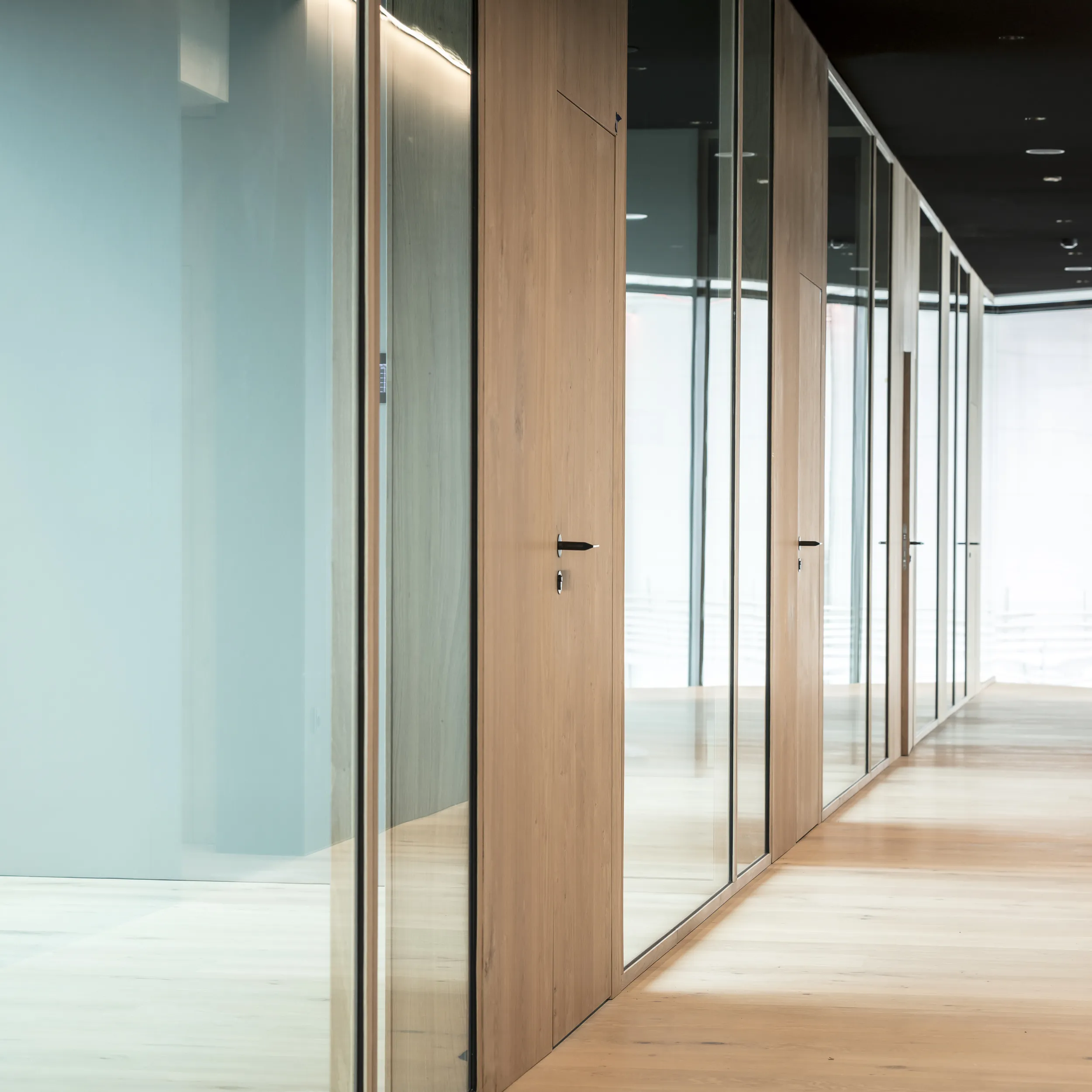 Hele bygningen er præget af masser af lys og transparens. Dørene står snorlige og fuldstændigt plant med glasvæggene.