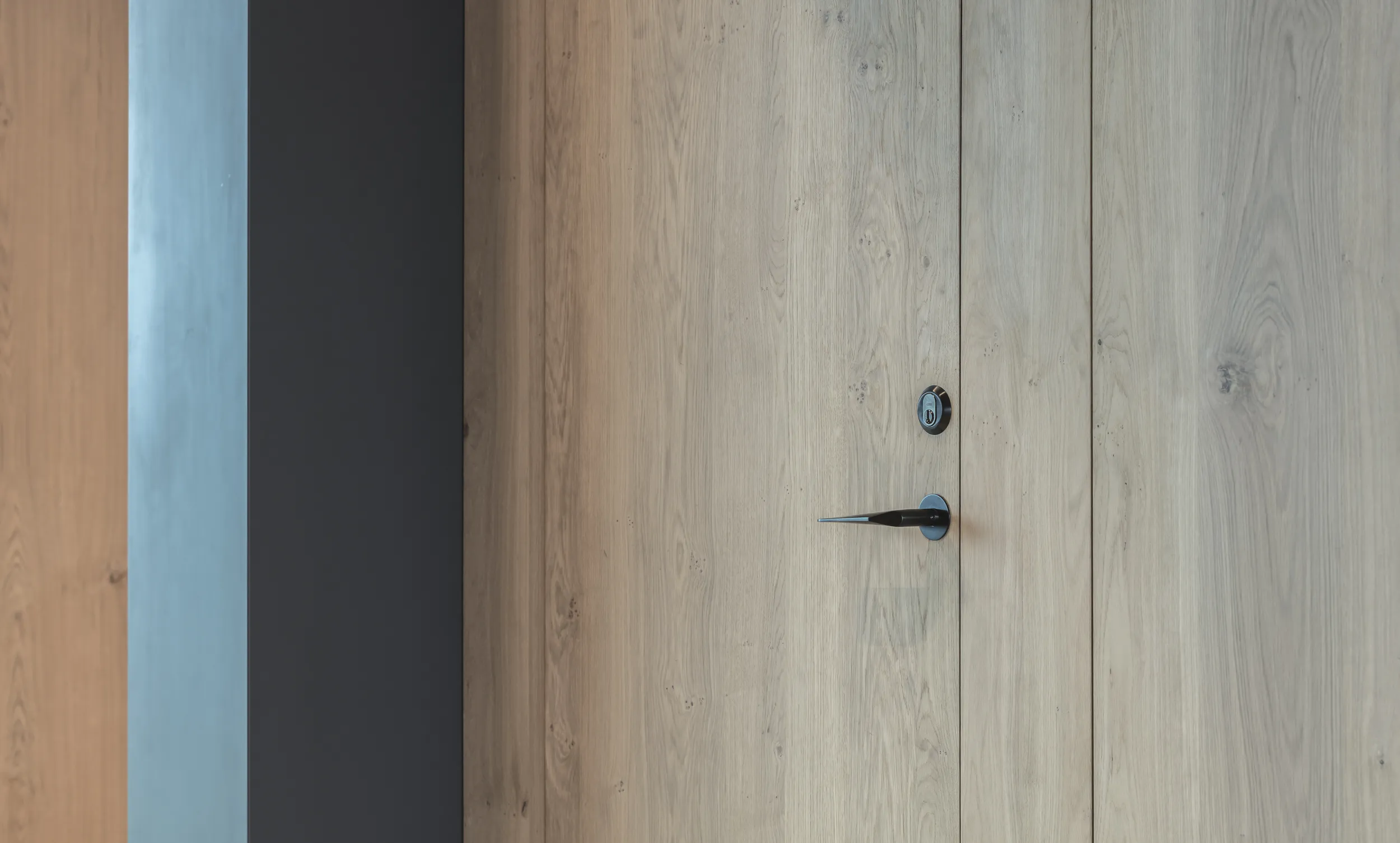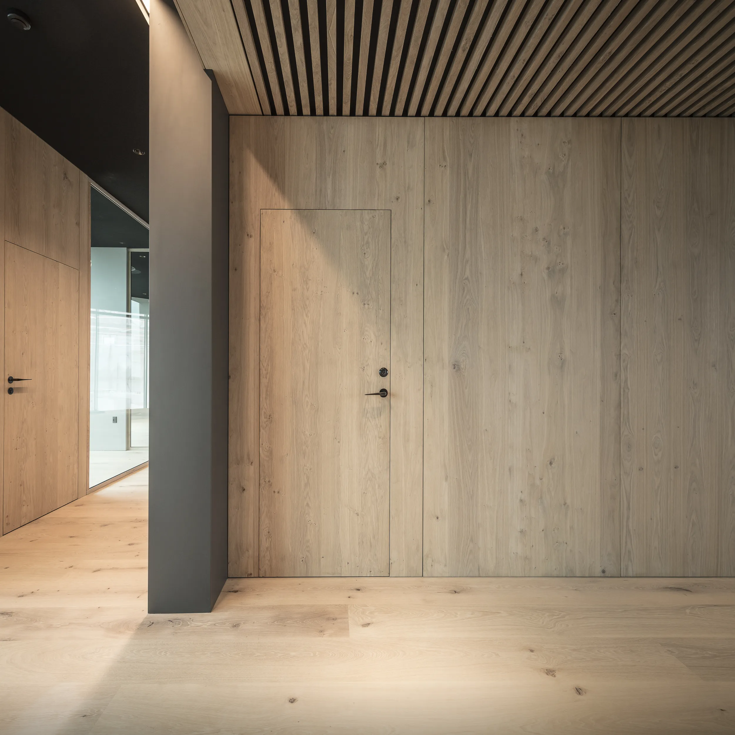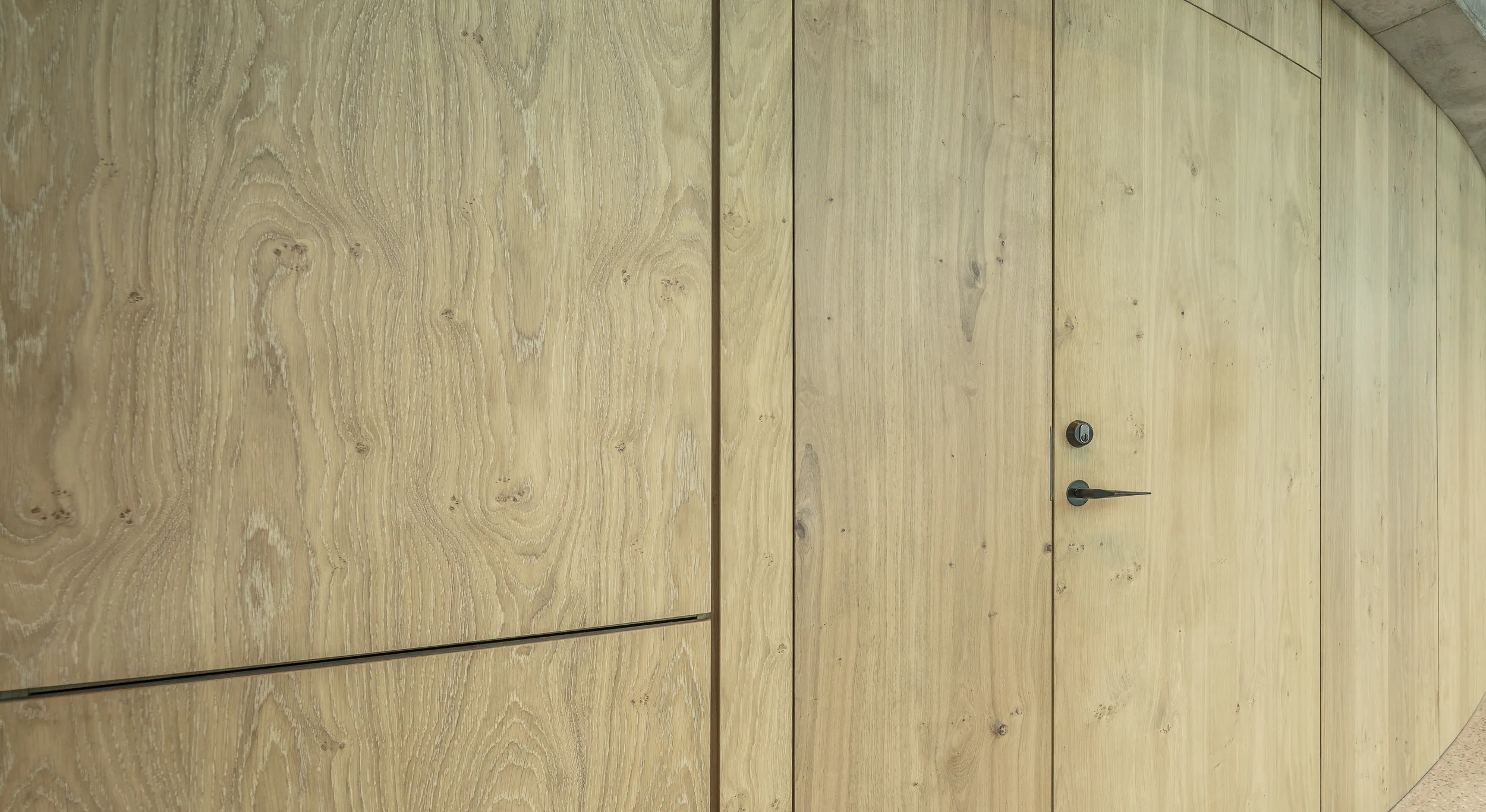 Buede branddøre fuldt integreret i panelvæg i egetræ