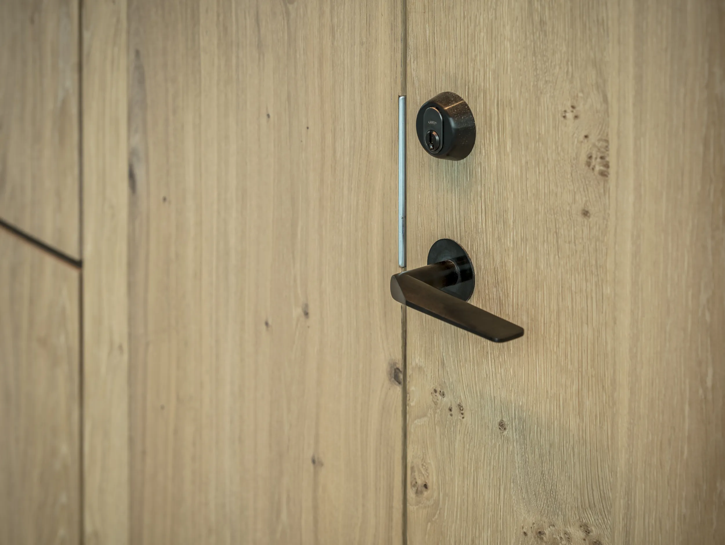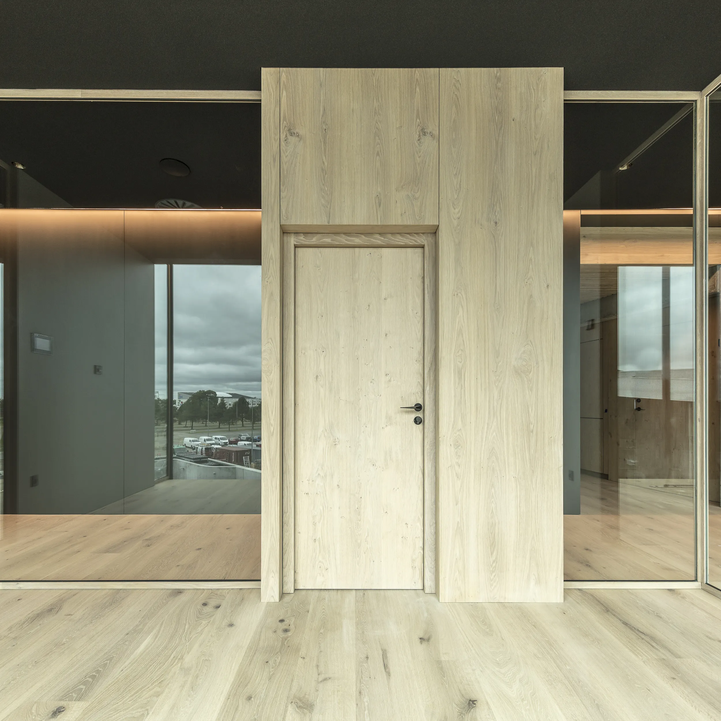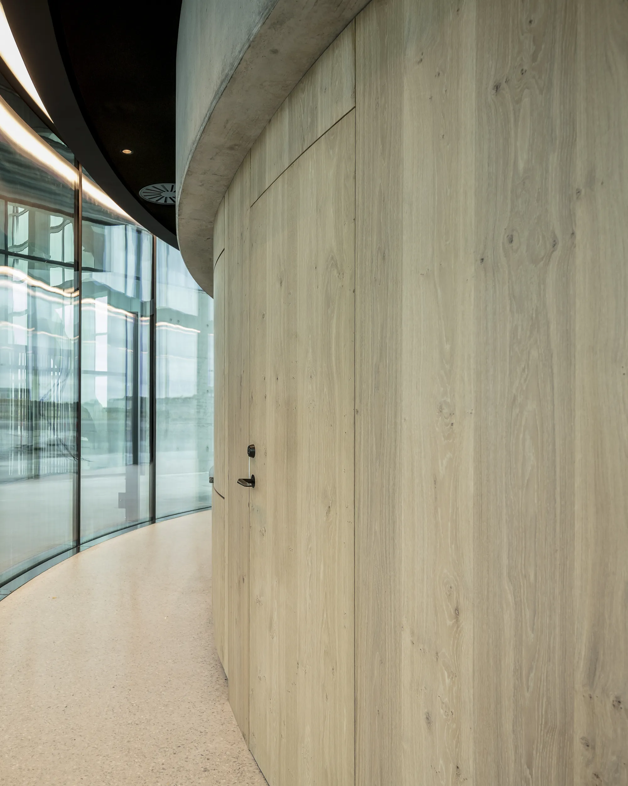 Buede branddøre fuldt integreret i panelvæg i egetræ