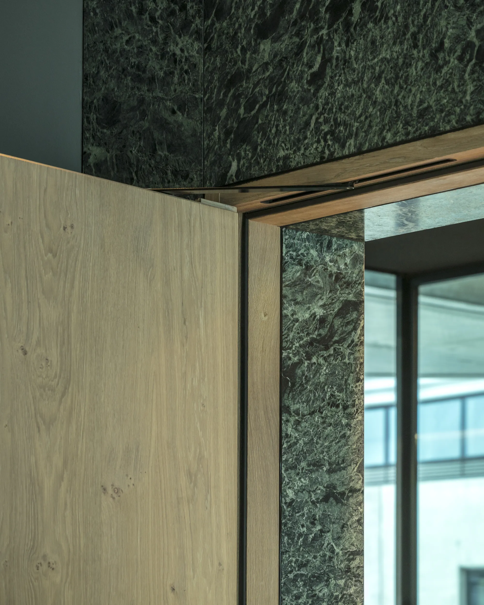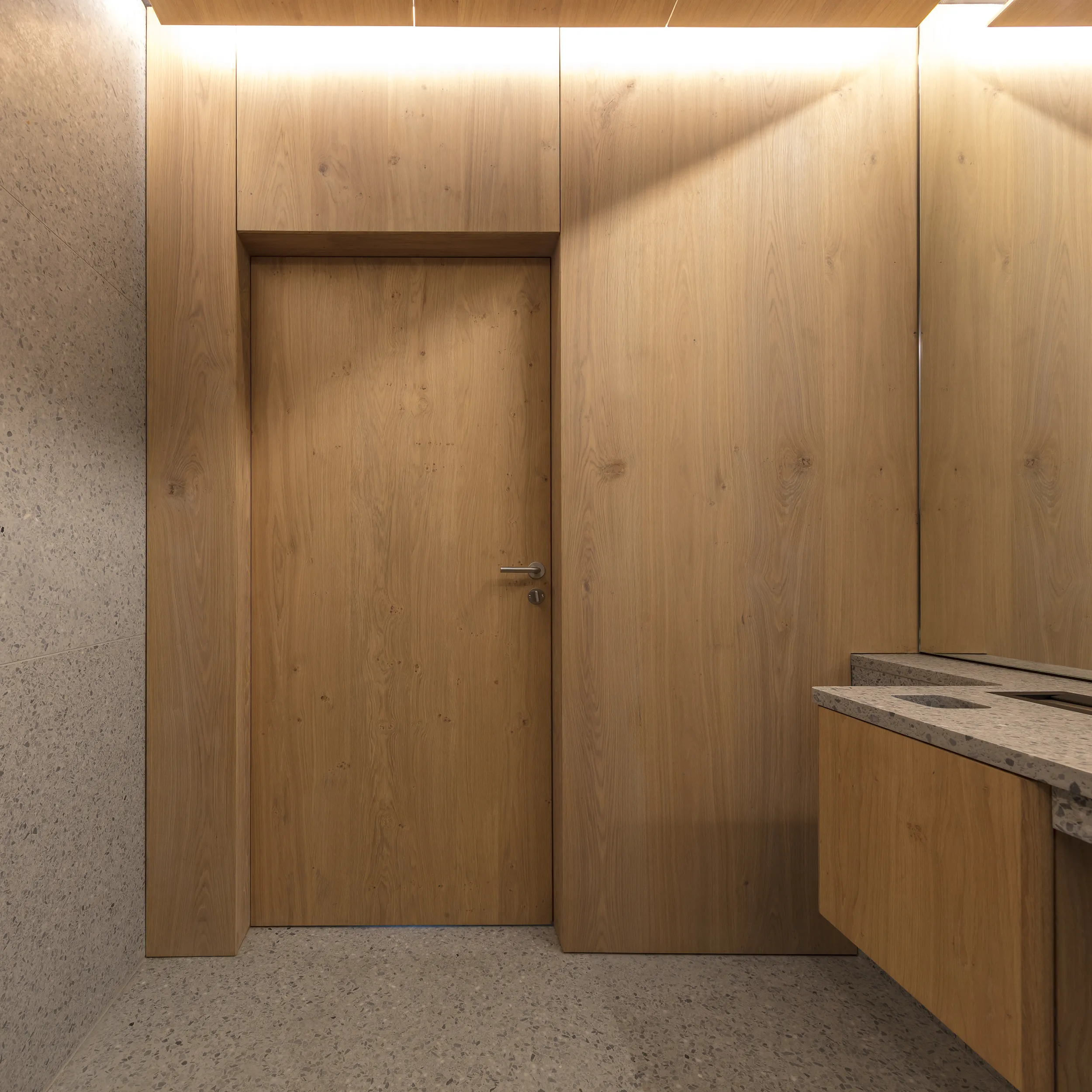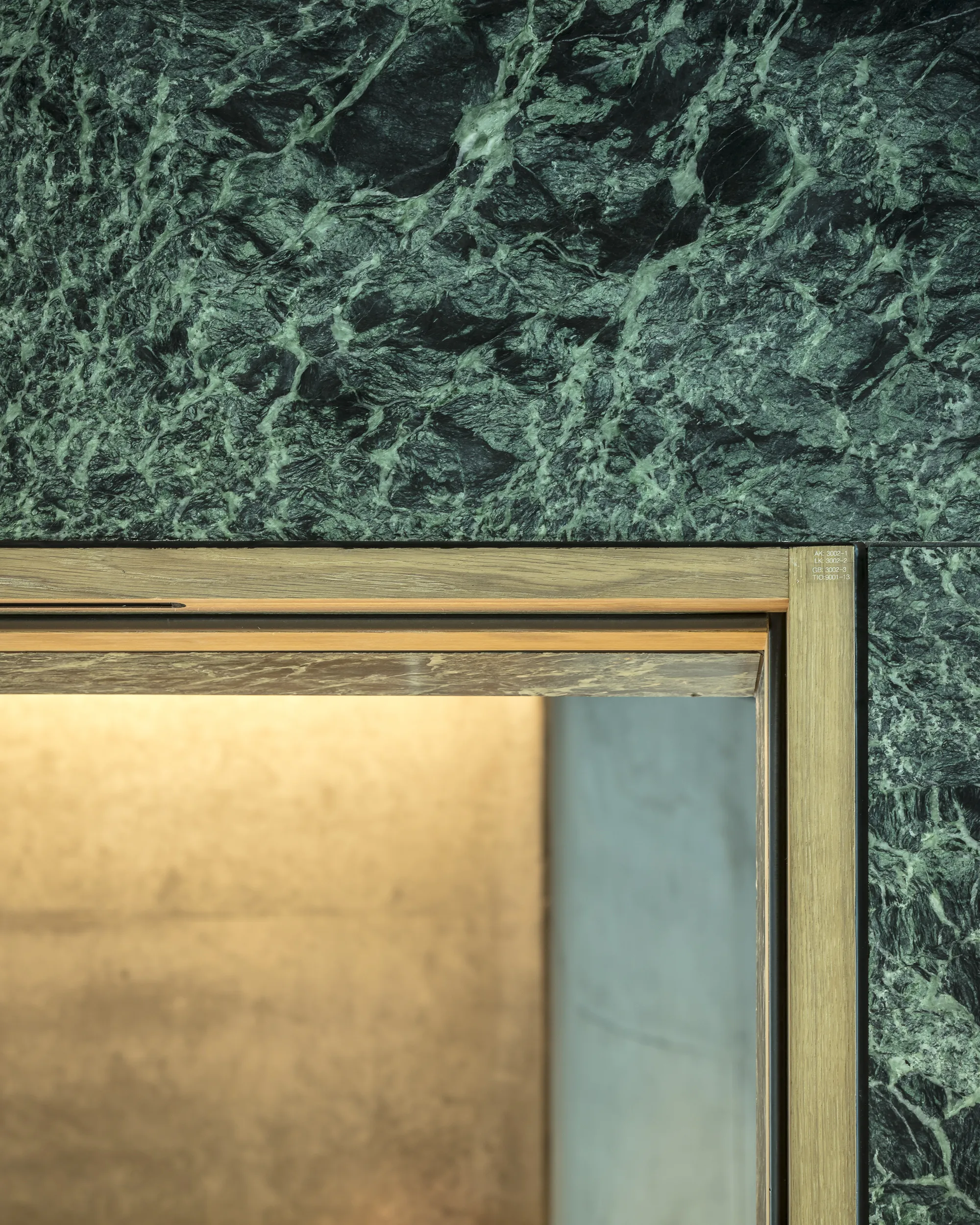 Det gyldne egetræ står smukt og roligt i kontrast mod vægge, der er beklædt med en unik og effektfuld mørk marmor.