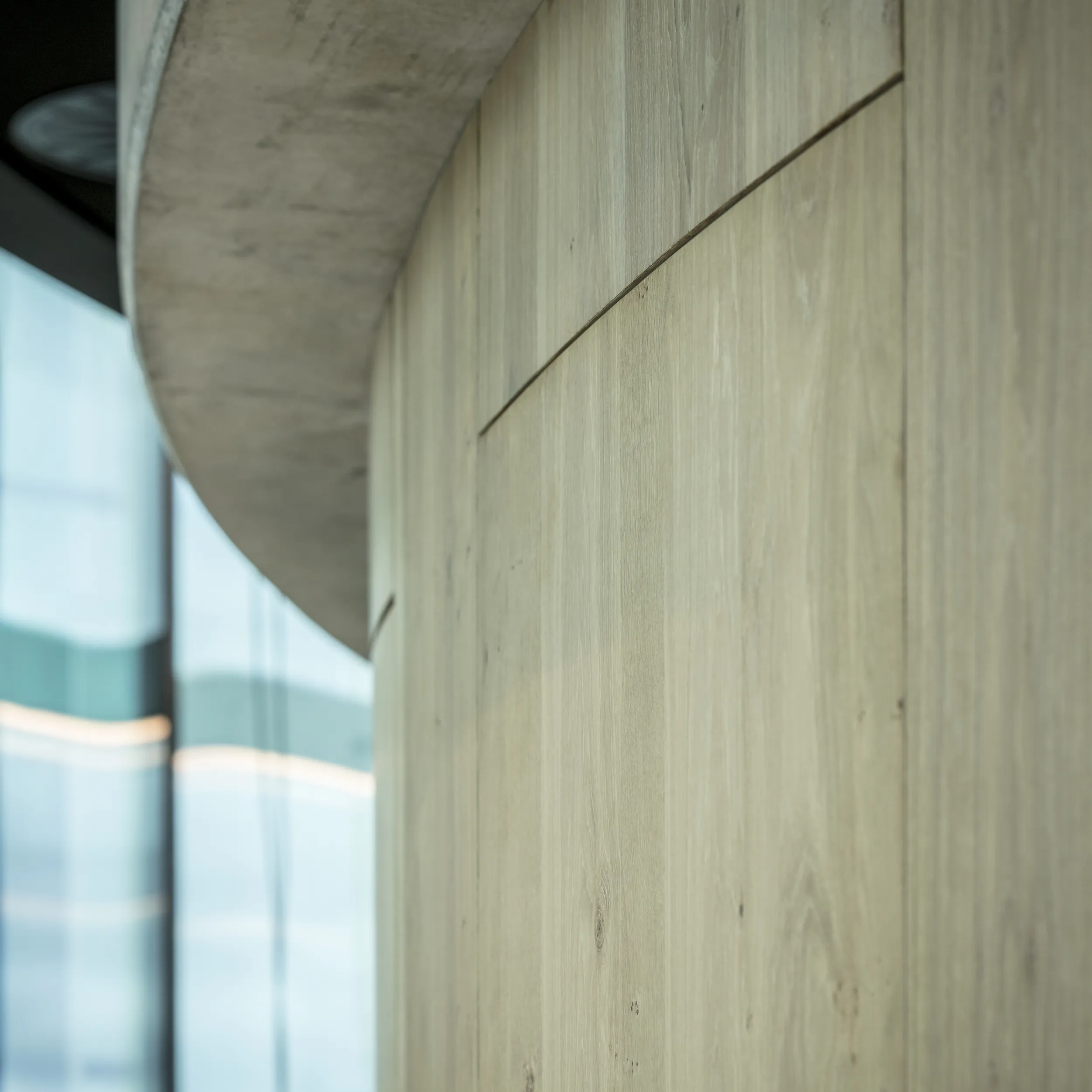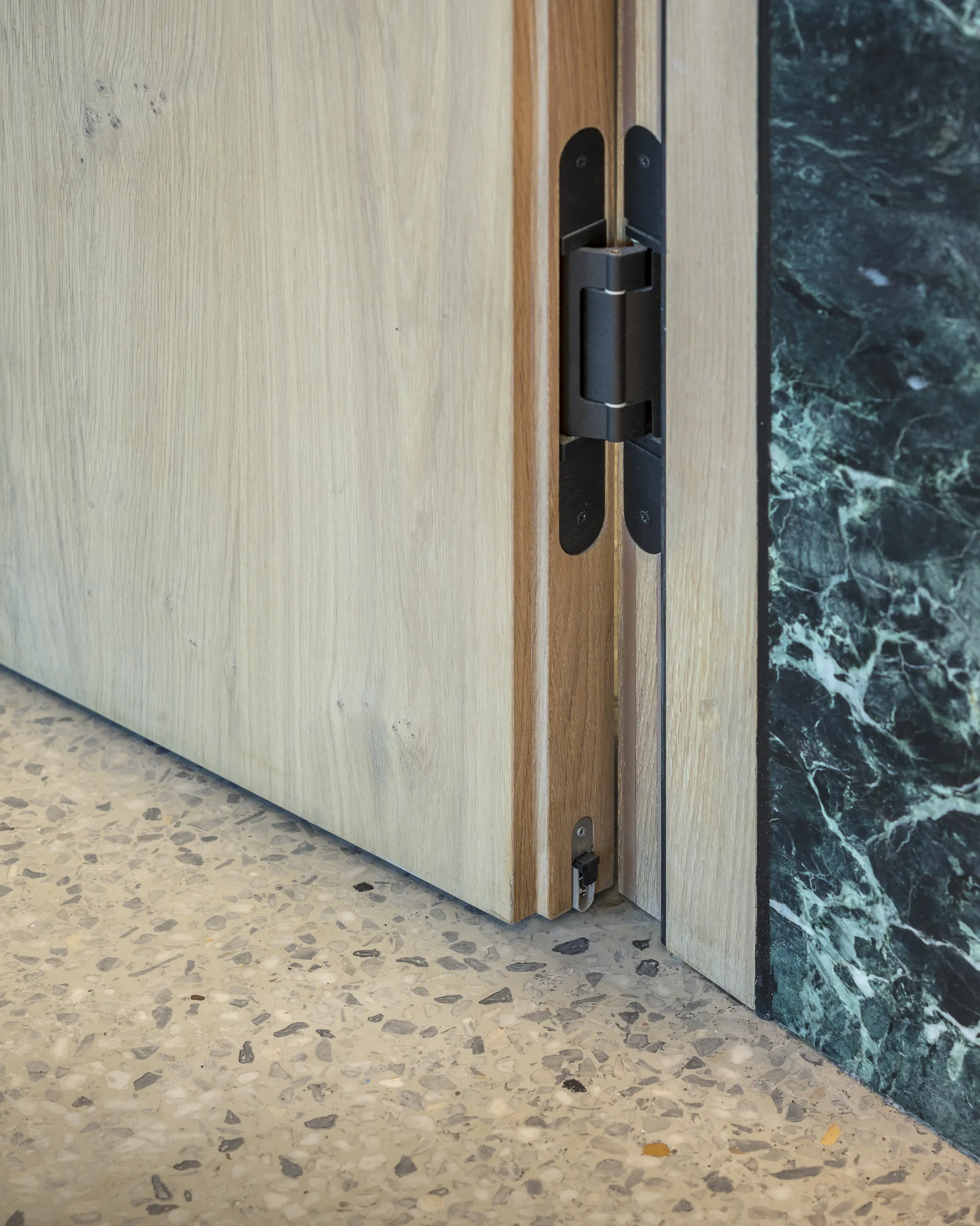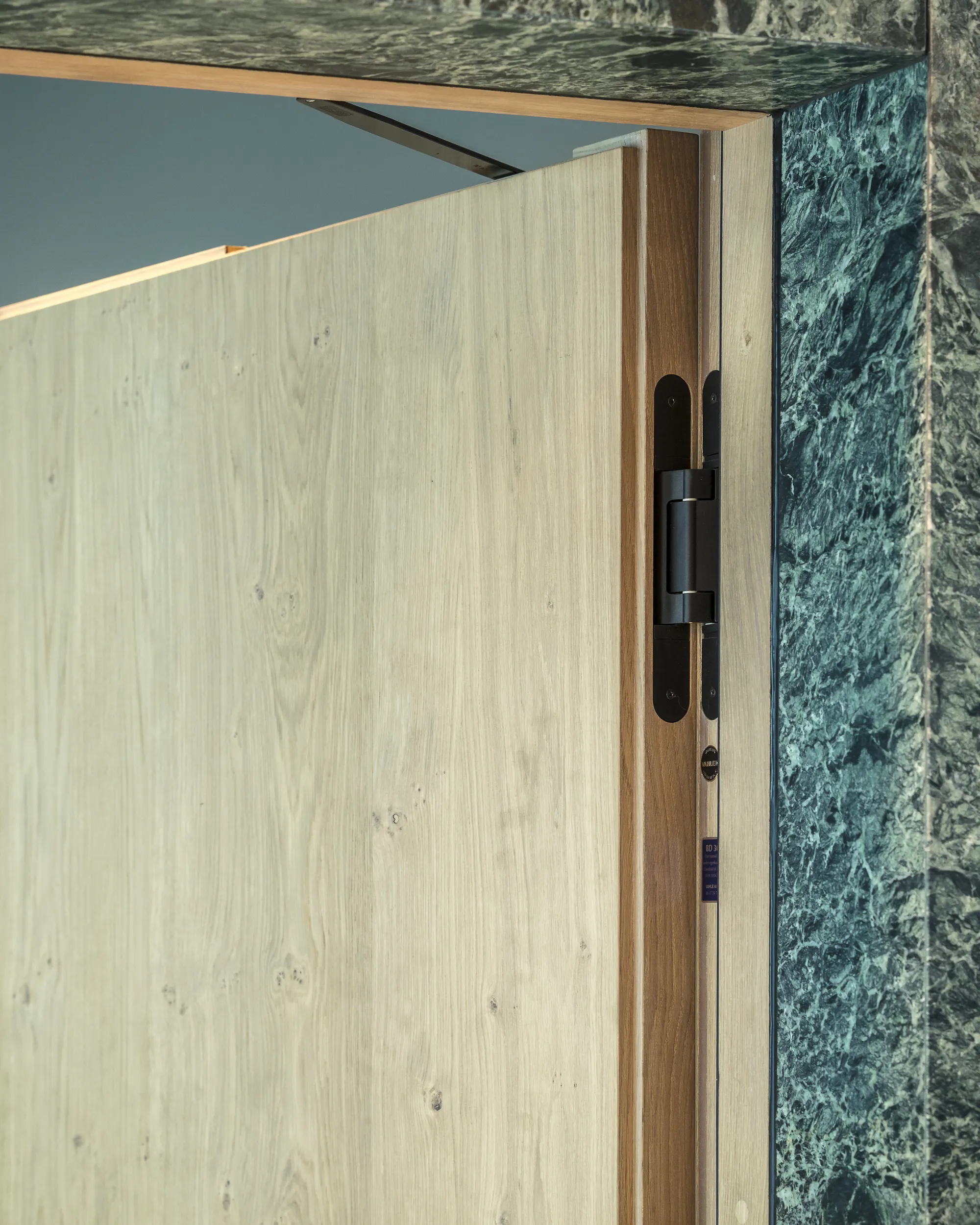 Det gyldne egetræ står smukt og roligt i kontrast mod vægge, der er beklædt med en unik og effektfuld mørk marmor.