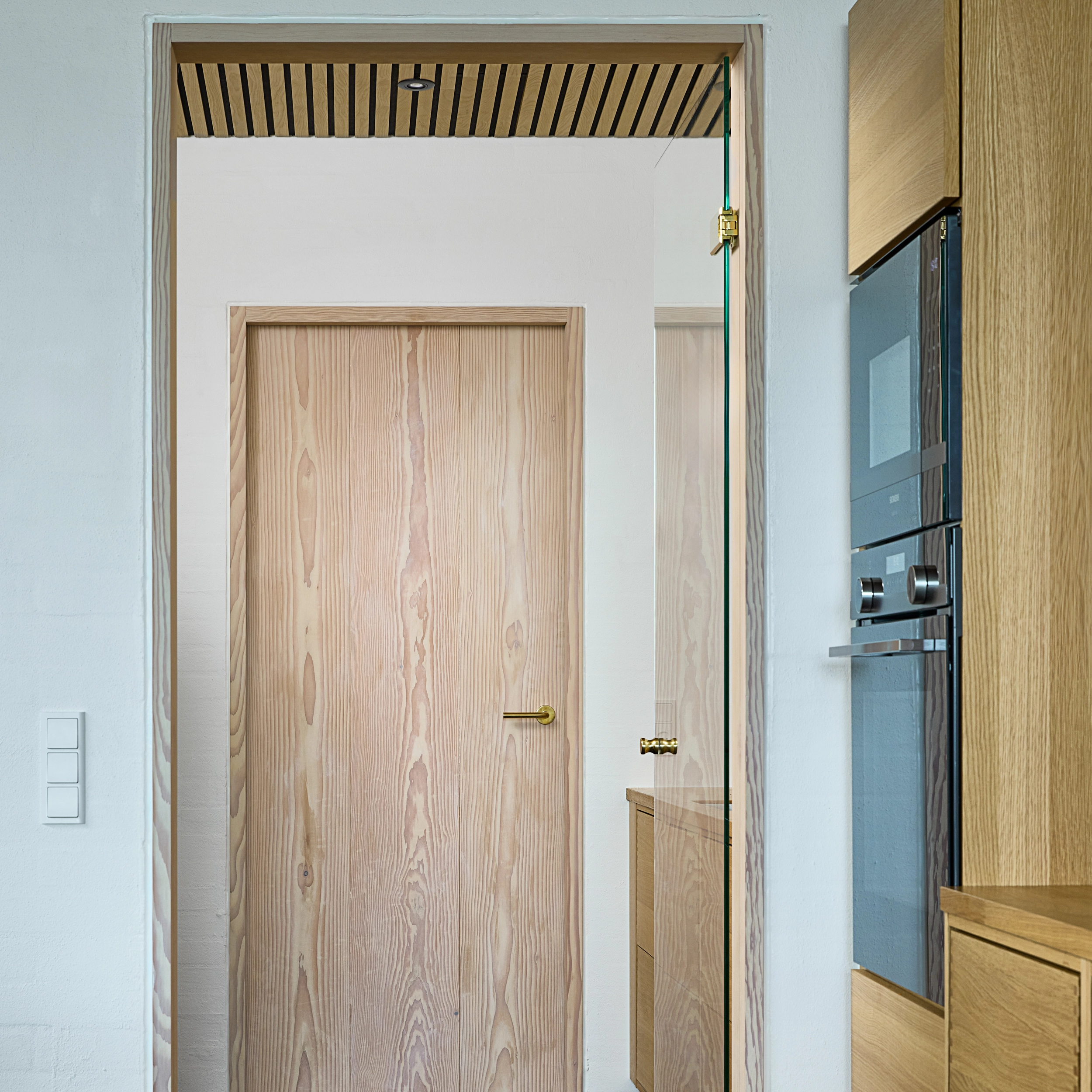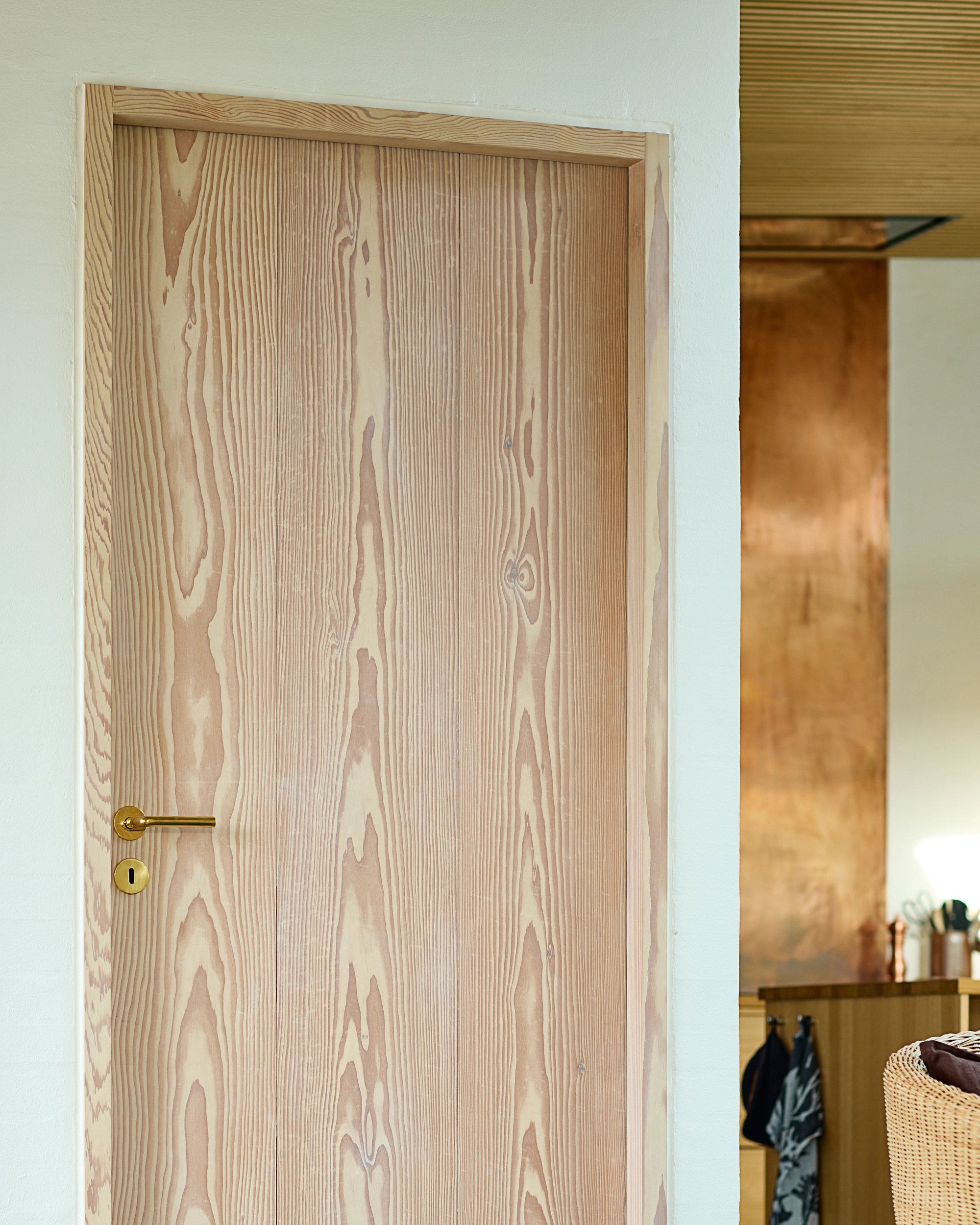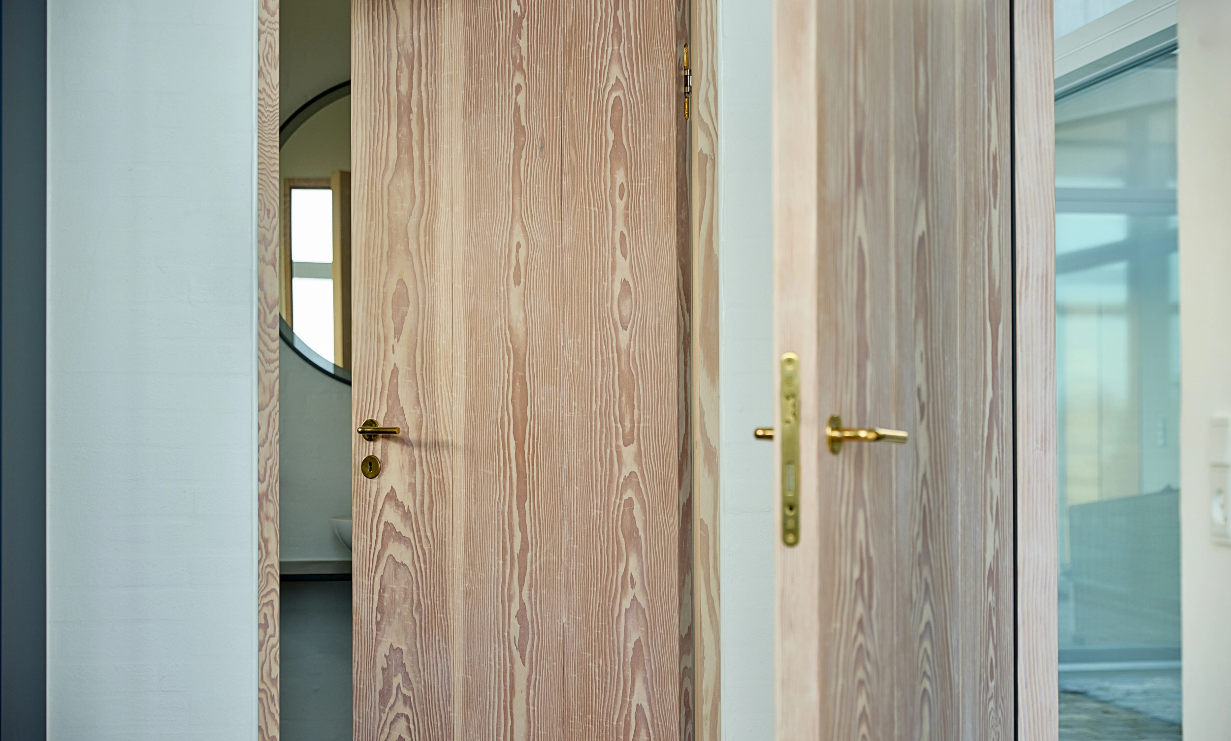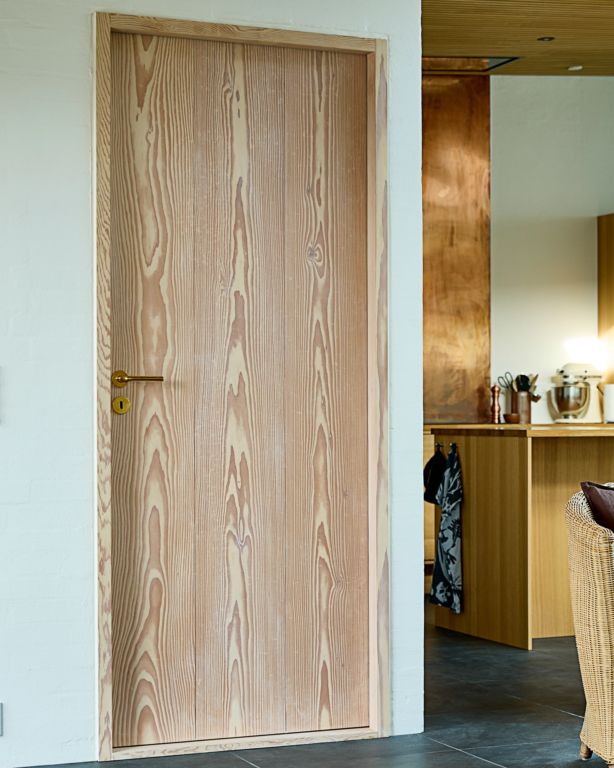 Alle de indvendige døre er fremstillet som Douglas Dinesen LAYERS by Vahle – med én undtagelse: en glasdør, som bygherren ønskede. For at bevare den visuelle helhed er også glasdørens karm udført i massiv douglastræ og designet præcis som de øvrige karme.