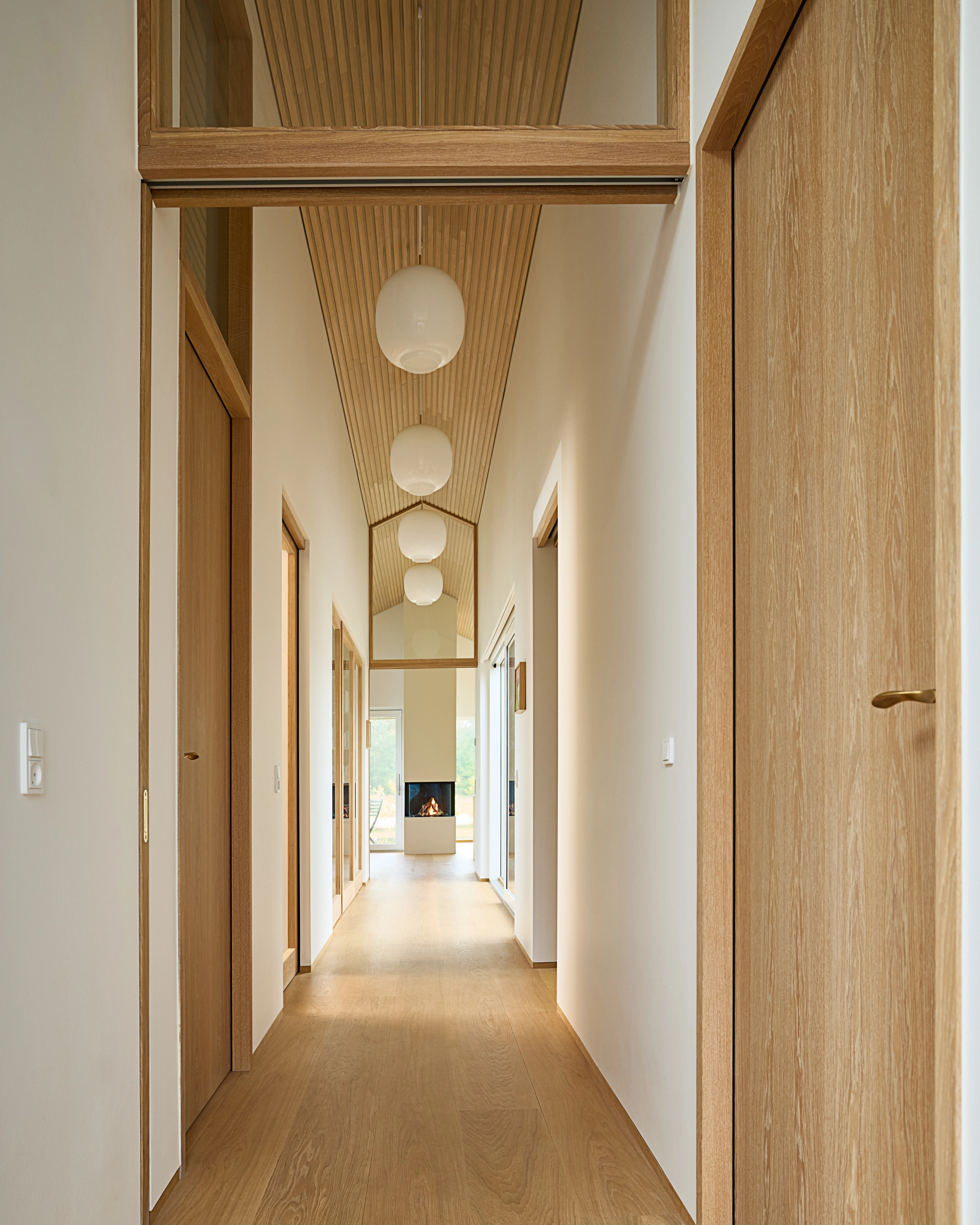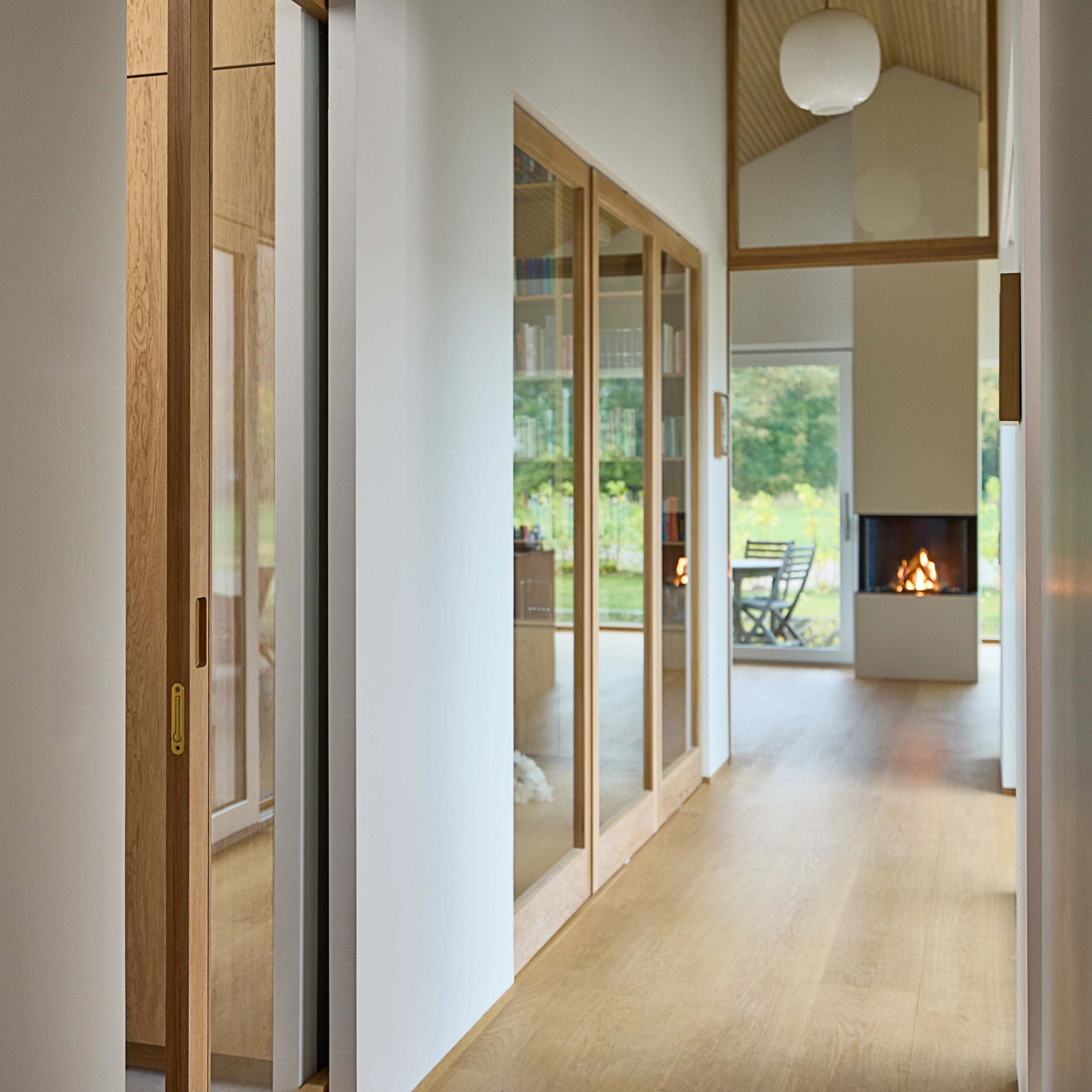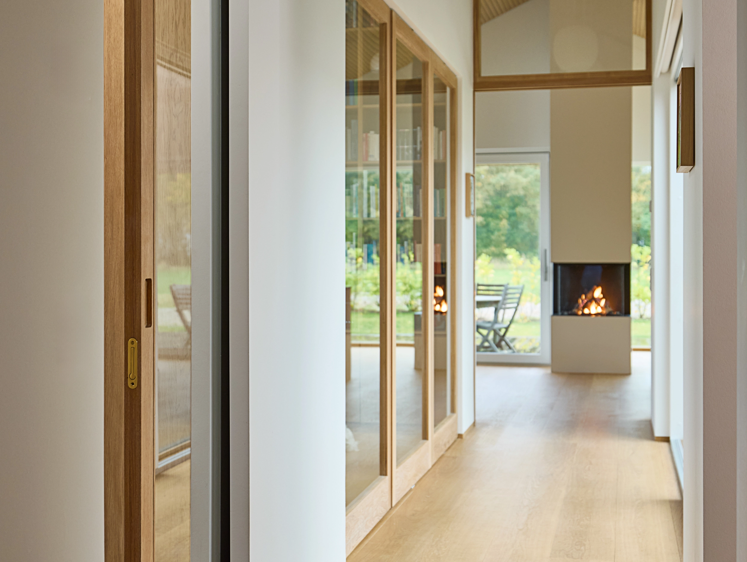 I hver ende af huset markerer skydedøre overgangene mellem opholdsrum og private zoner som køkken-alrum og soveværelse. Når dørene står åbne, skaber de en harmonisk gennemstrømning af lys og luft, mens lukkede døre stadig tillader dagslys gennem glasoverpartierne.