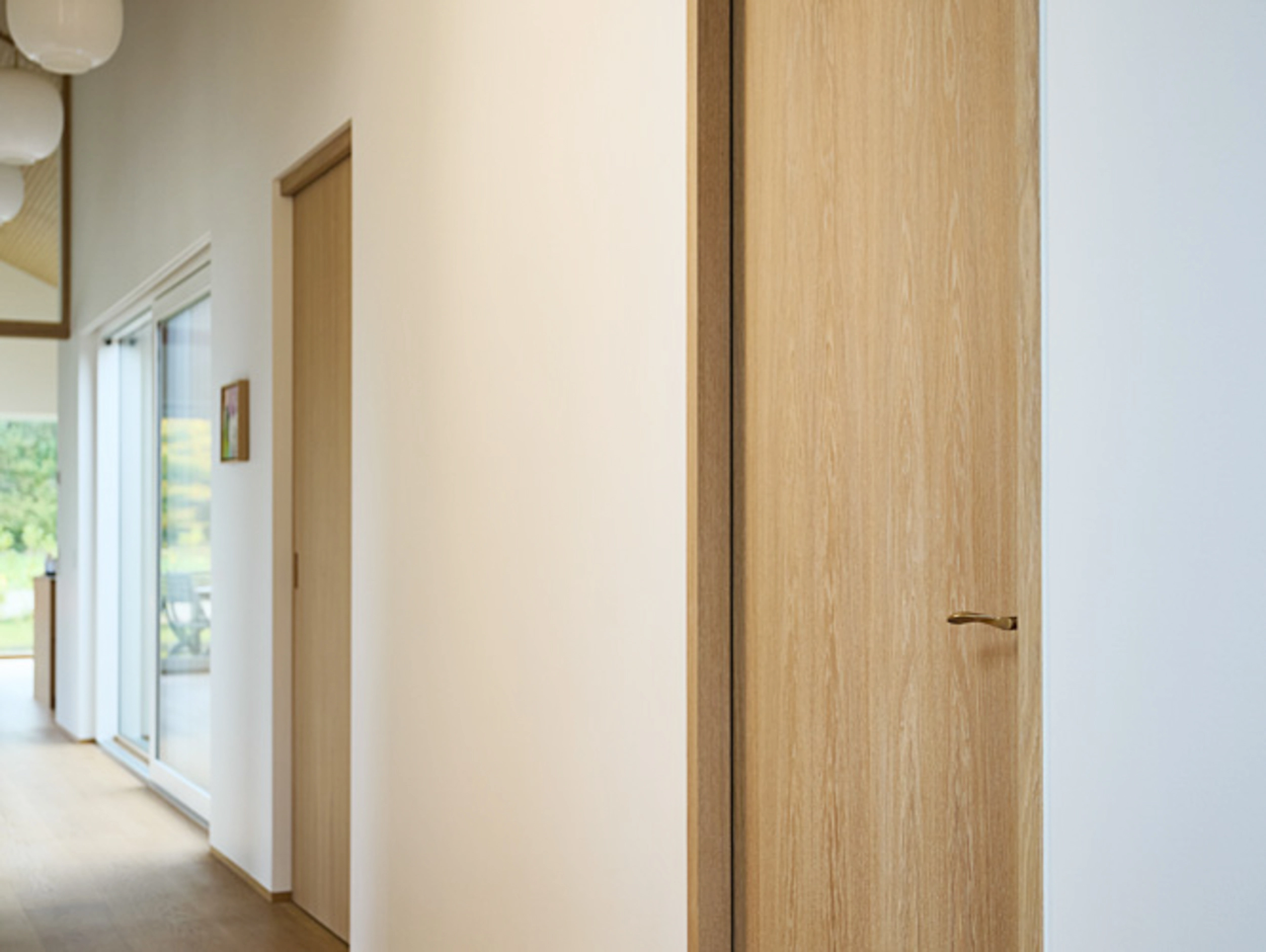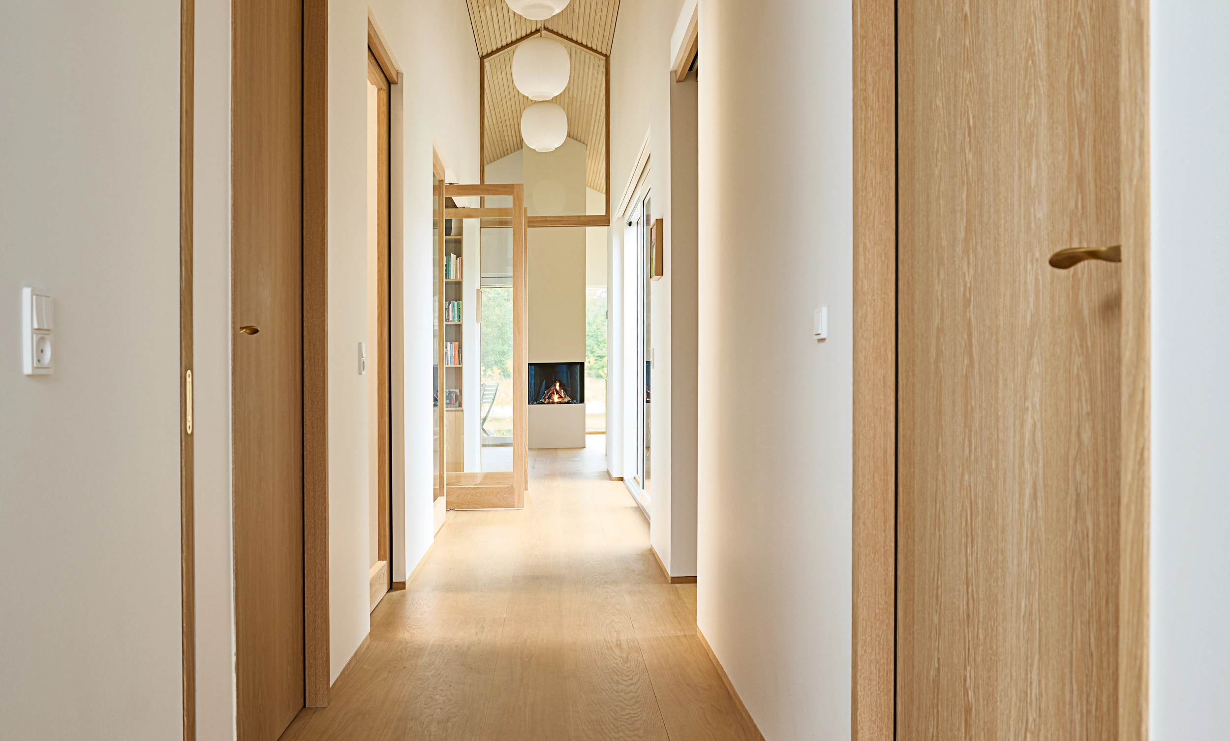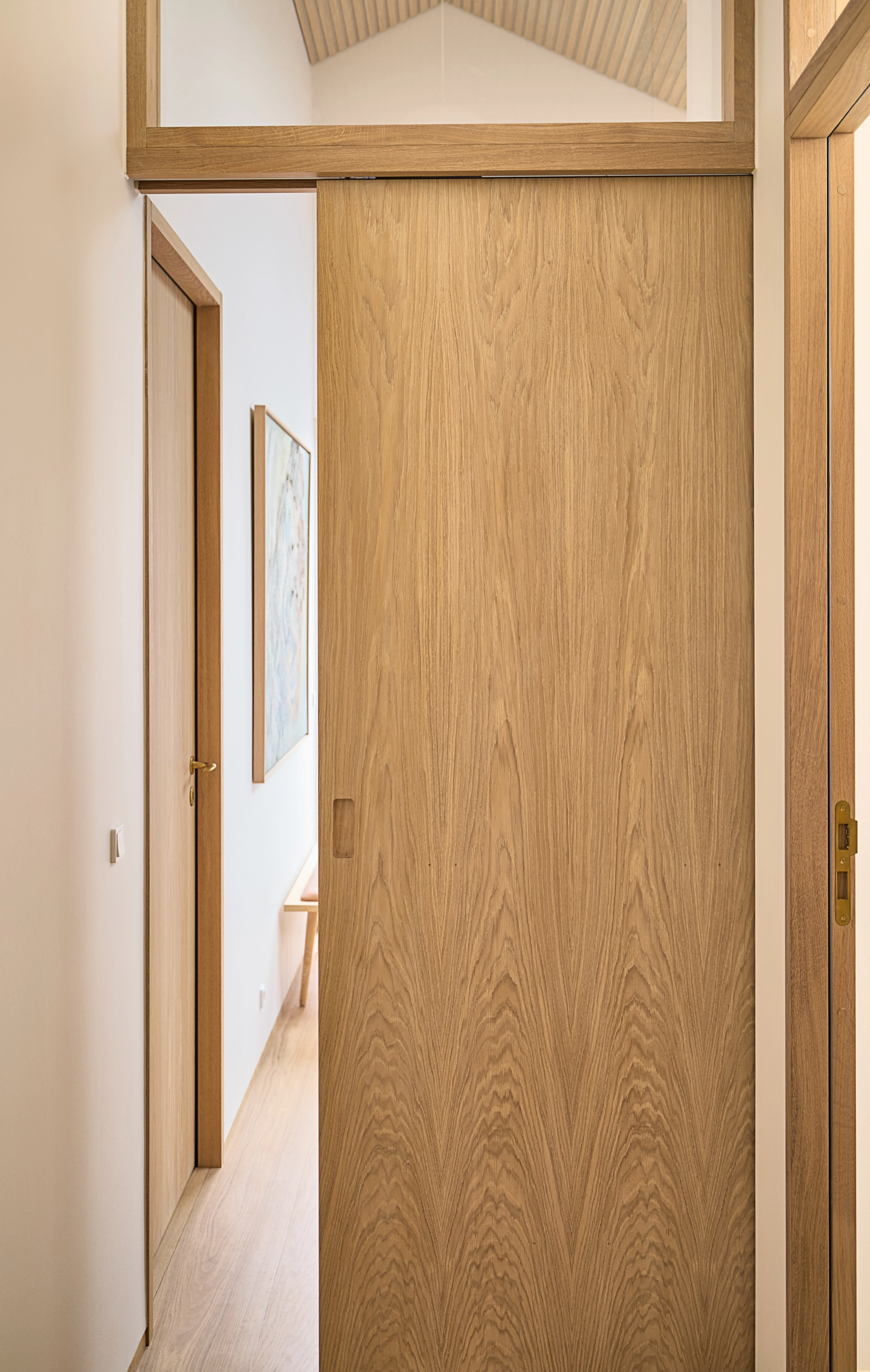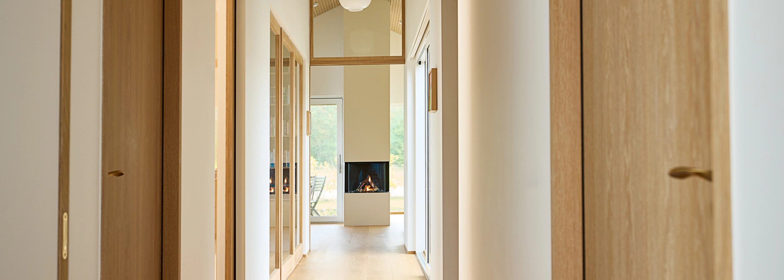 I dette hjem er detaljerne nøje gennemtænkt, og træhåndværket er løftet til et niveau, hvor æstetik og funktionalitet smelter sammen. Huset er præget af gennemgående egetræ på de indvendige døre, som varierer i design og funktion afhængigt af rummenes anvendelse.