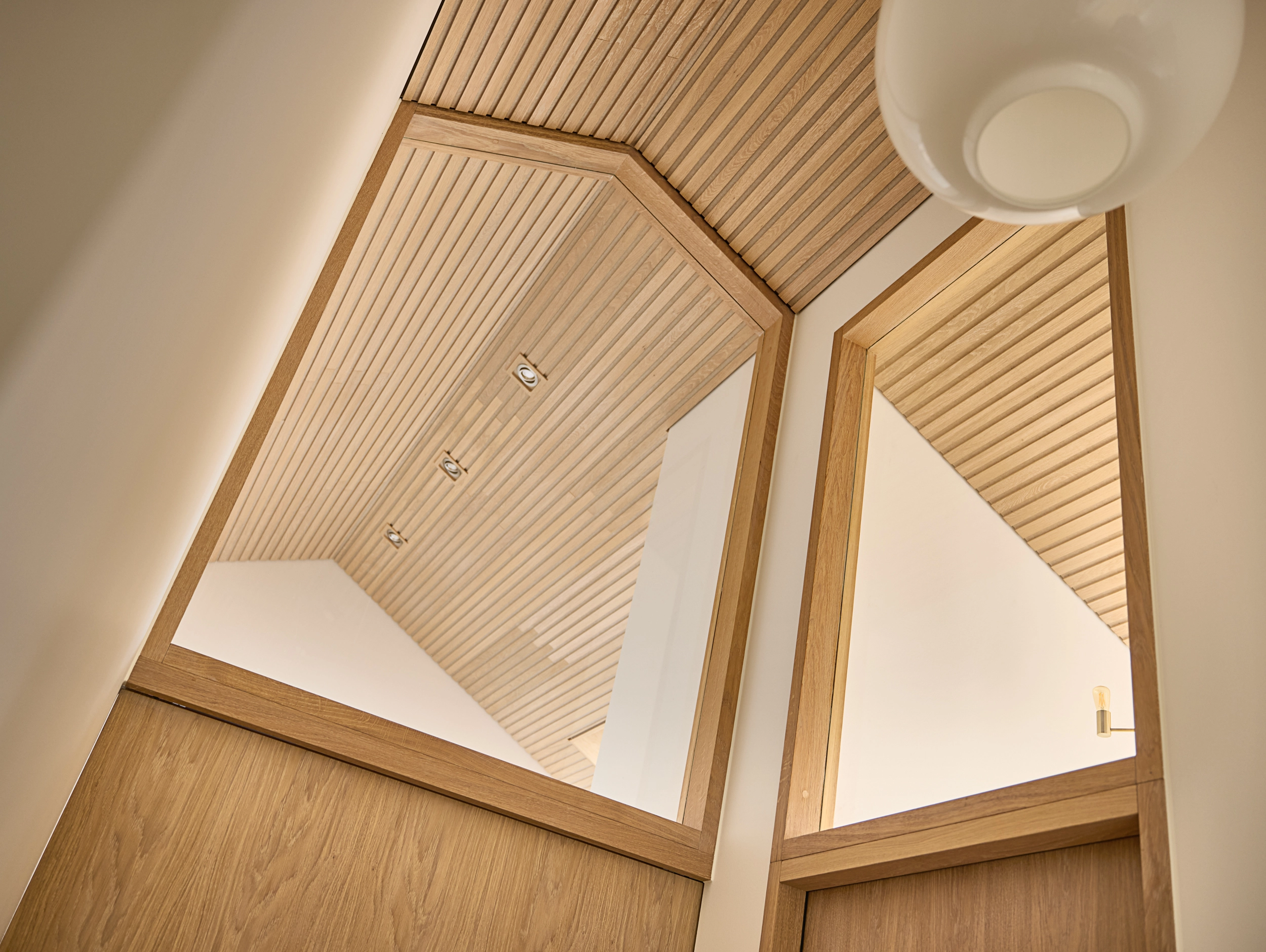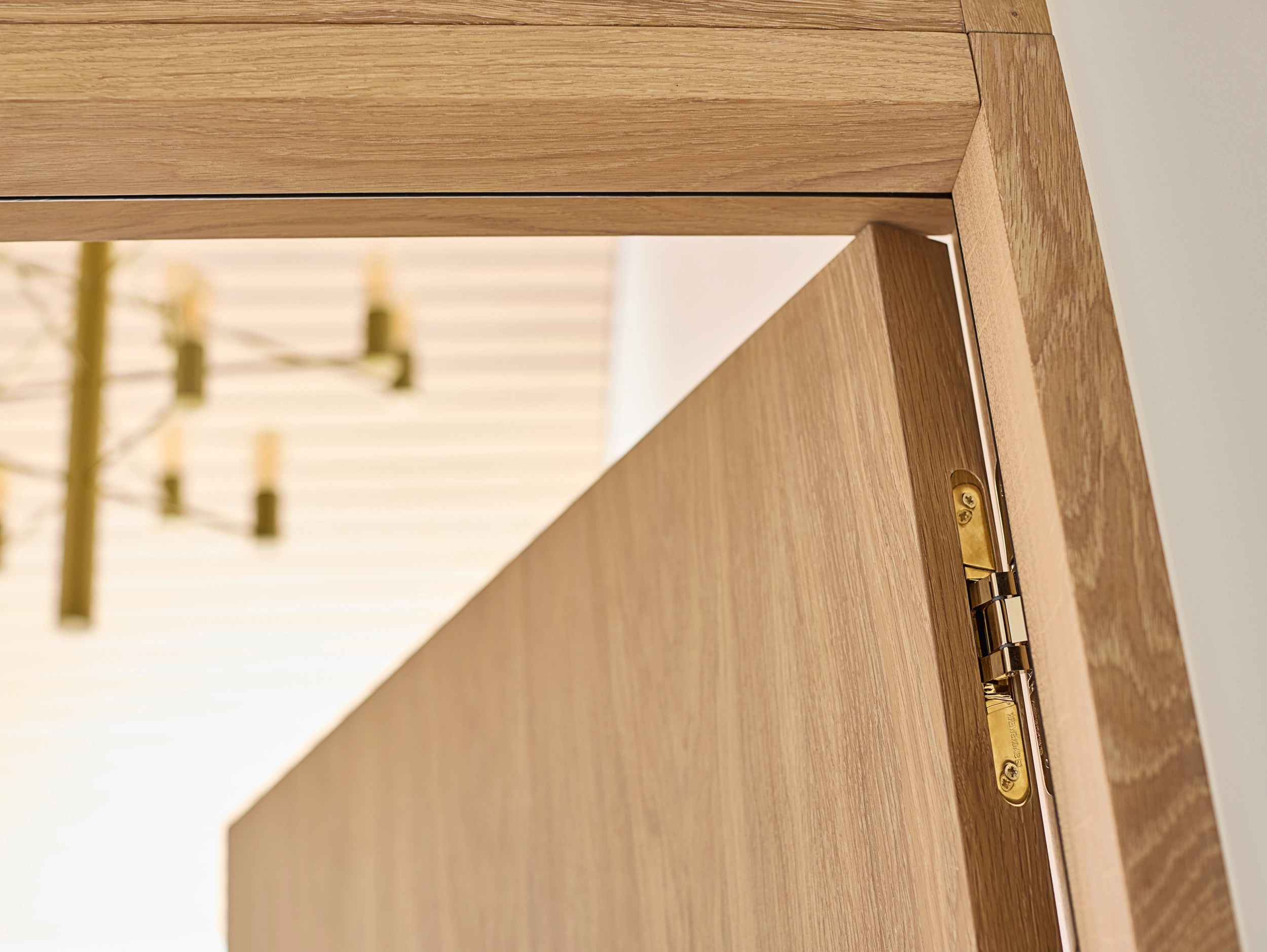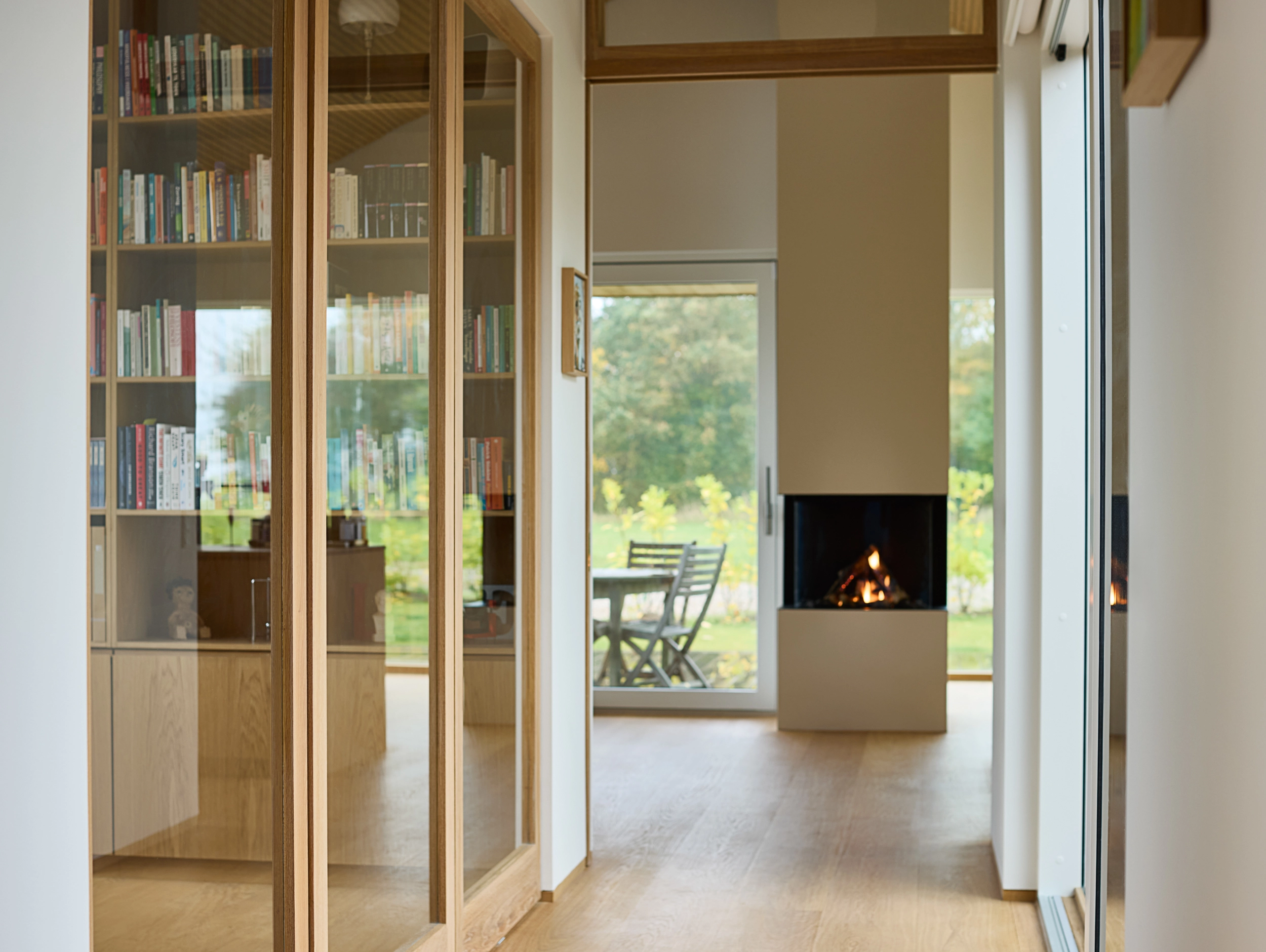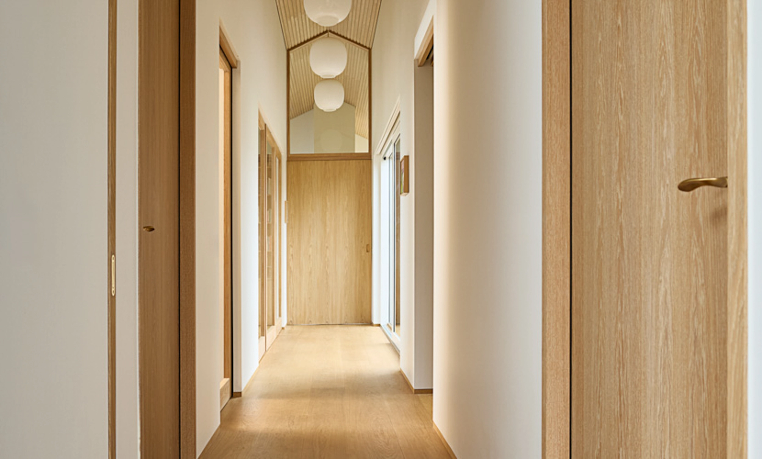 I dette hjem er detaljerne nøje gennemtænkt, og træhåndværket er løftet til et niveau, hvor æstetik og funktionalitet smelter sammen. Huset er præget af gennemgående egetræ på de indvendige døre, som varierer i design og funktion afhængigt af rummenes anvendelse.