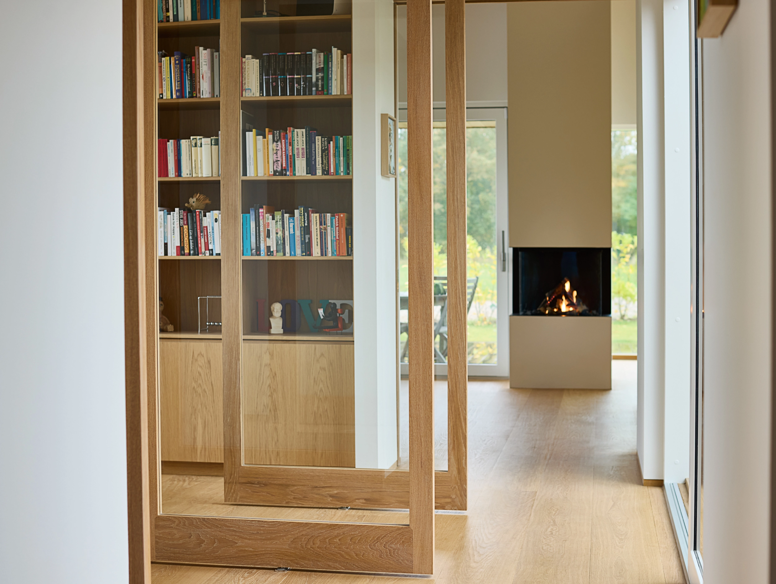 Pinoldørene kombinerer lysindfaldet fra en glasvæg med varme og taktilitet fra massivt egetræ. Bygherre ønskede oprindeligt en klassisk glasvæg ind til hjemmekontoret, men i samarbejde med Vahle blev løsningen raffineret: