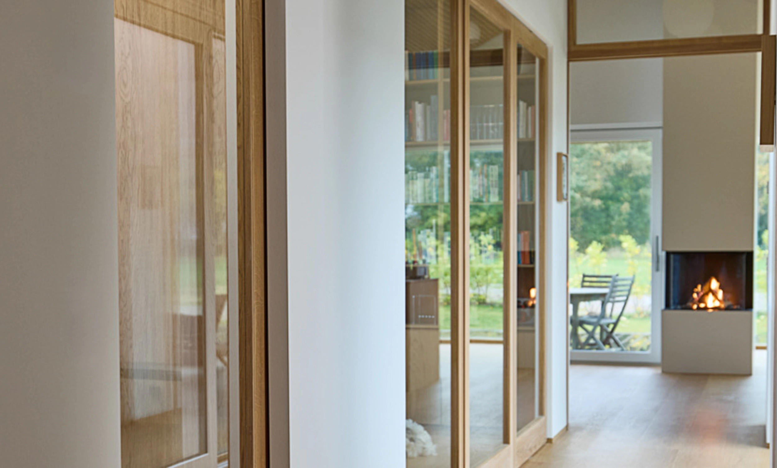 Dørene er fremstillet i massivt egetræ og glas og behandlet med samme olie som husets øvrige døre, hvilket sikrer et ensartet udtryk. Med deres tre positioner kan de både lukke af eller åbne op i to retninger, hvilket tilfører fleksibilitet til hverdagen.