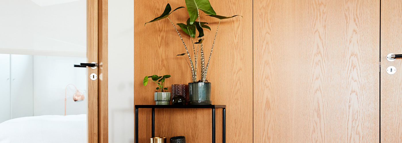 I et sommerhus bliver de indvendige døre af egefiner en integreret del af en væg, der er beklædt med det samme træ. Væggen med dørene fremstår som et møbel i indretningen.