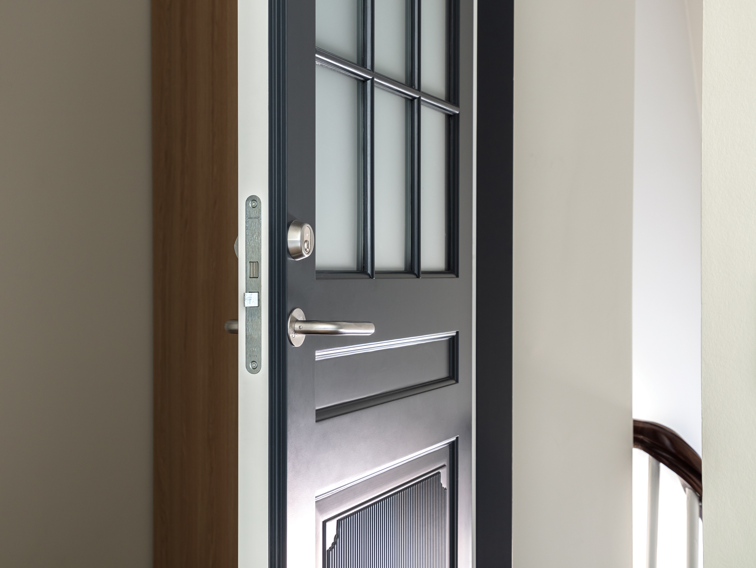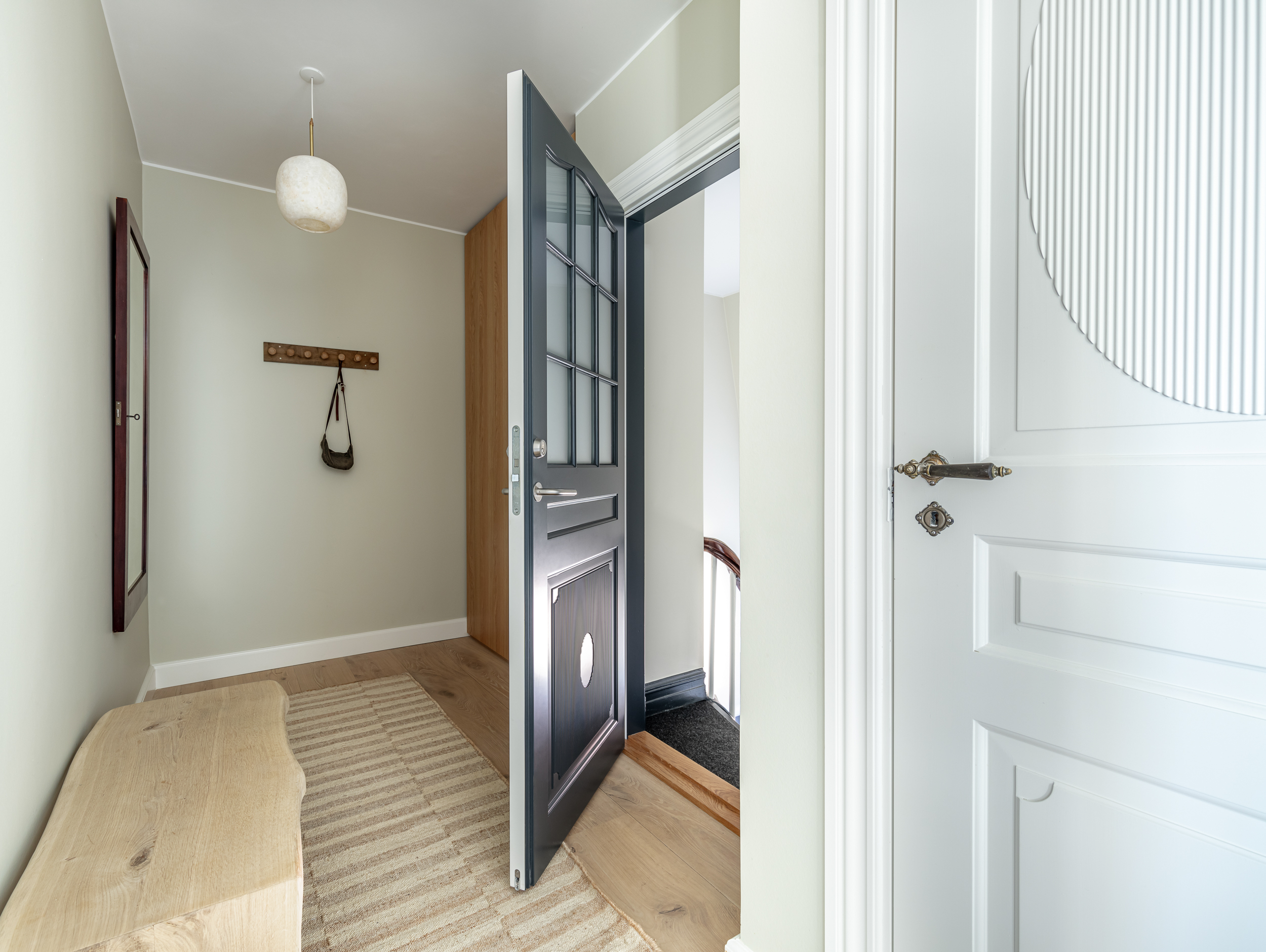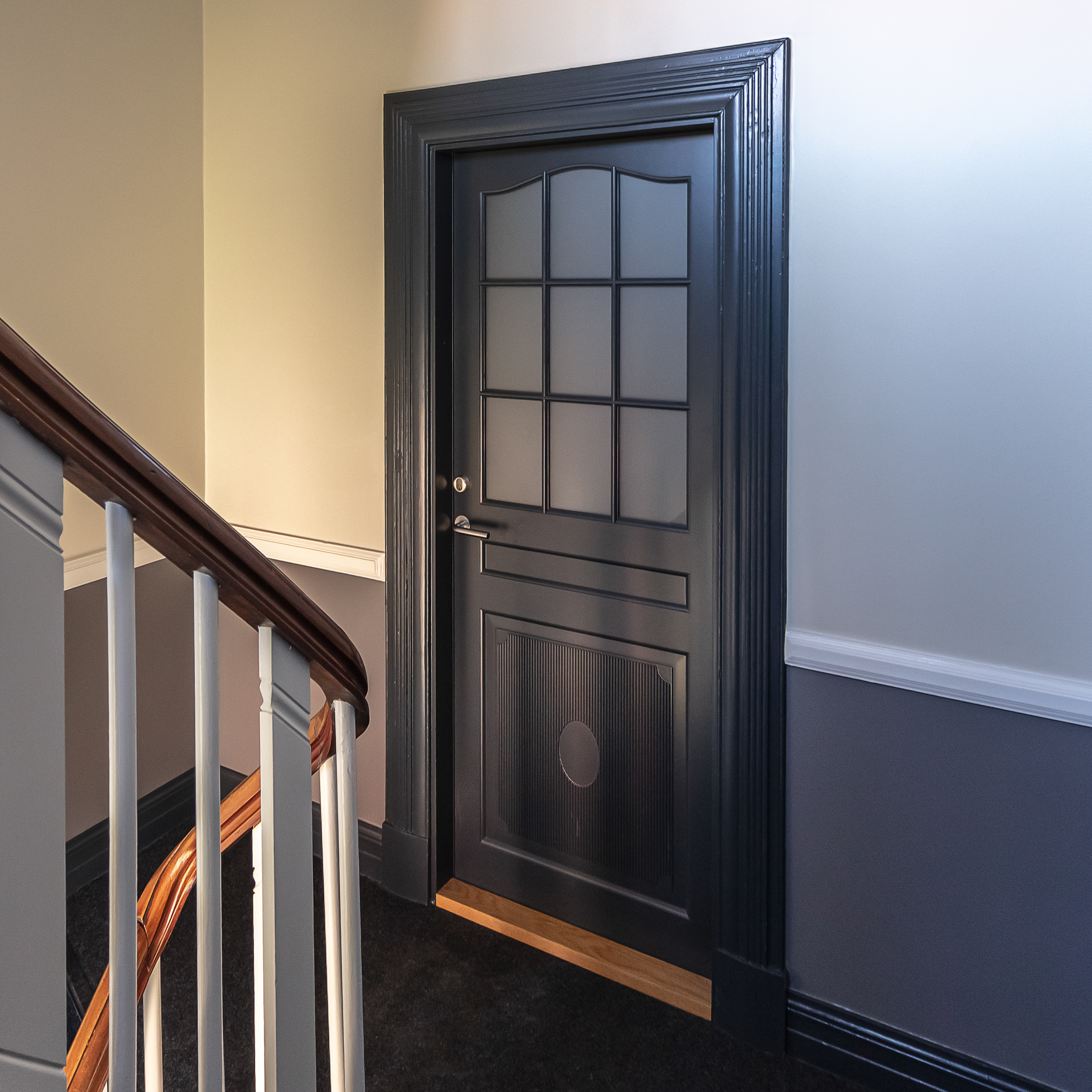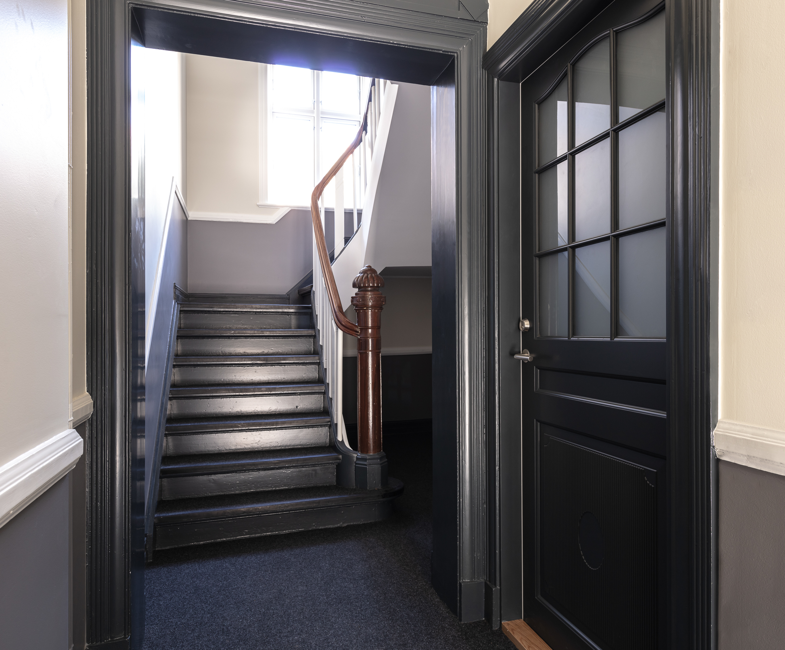 De nye fyldningsdøre i opgangen er malet mørkegrå, så atmosfæren er som den oprindelige