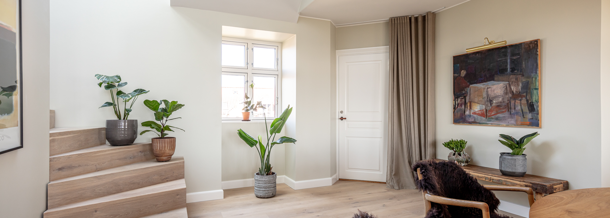 Den øverste lejlighed har fået inddraget det gamle tørreloft, så det nu er en stor lejlighed i to plan. Lejligheden er totalt renoveret fra A til Z, og der er valgt løsninger og materialer fra øverste hylde.
