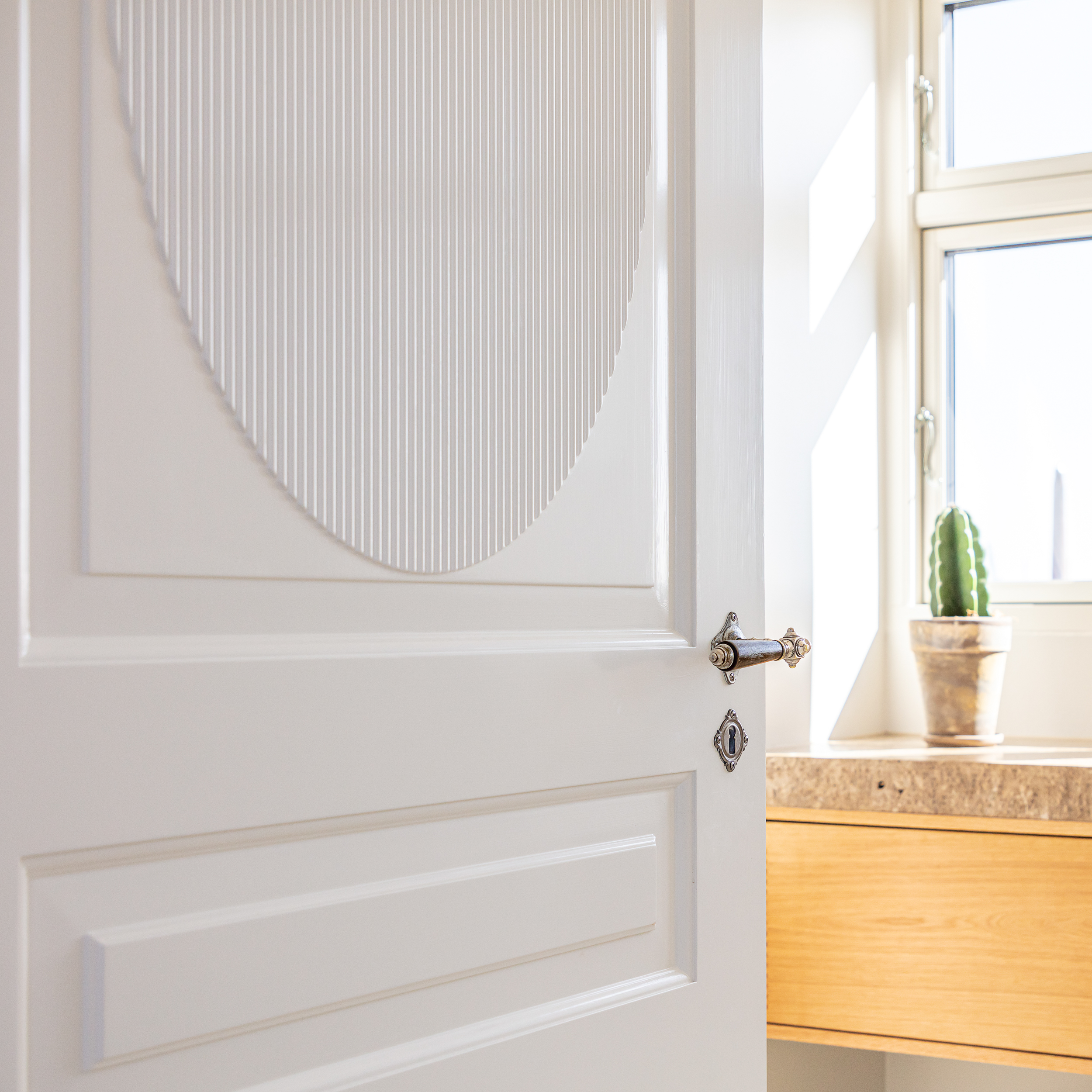 I den nye lejlighed fortsætter udtrykket på dørene fra opgangen