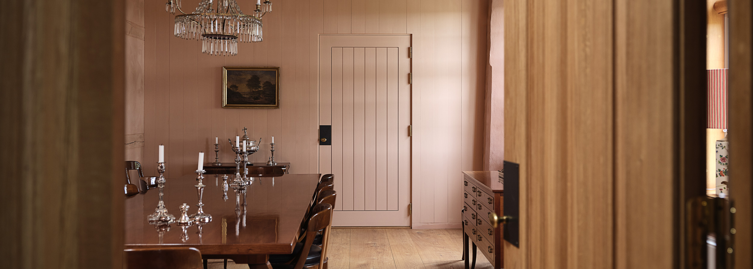 I spisestuen er vægge og dør malet i en sart rosa.
