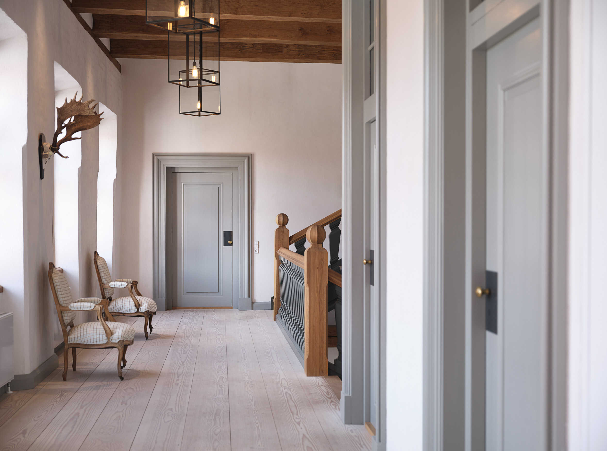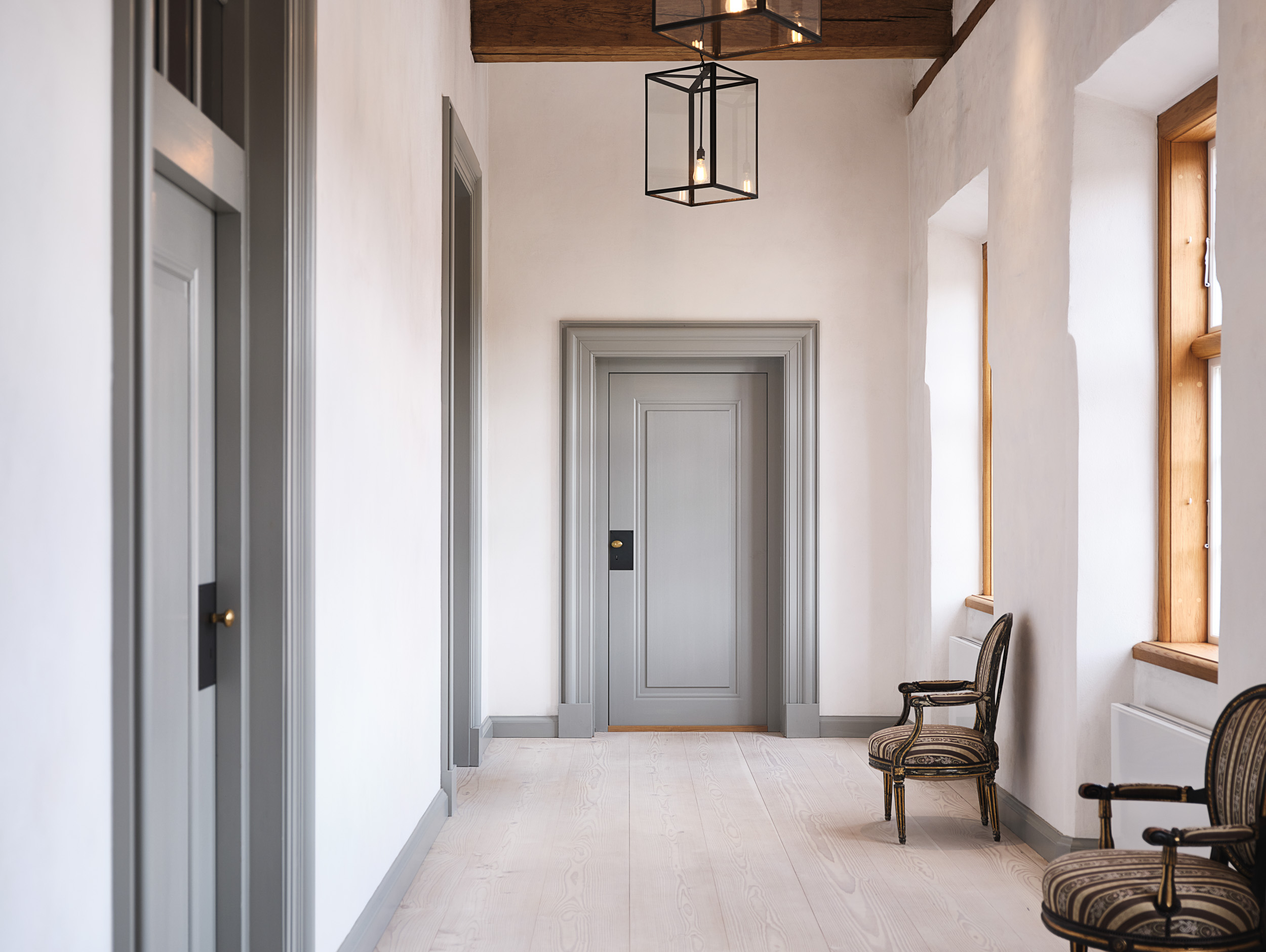- Fyldningsdøre med lange fyldninger, en nutidig og forfinet fortolkning af de oprindelige revledøre, som fandtes på godset. De giver et moderne modspil til de klassiske former, men fastholder fornemmelsen af historisk kontinuitet.